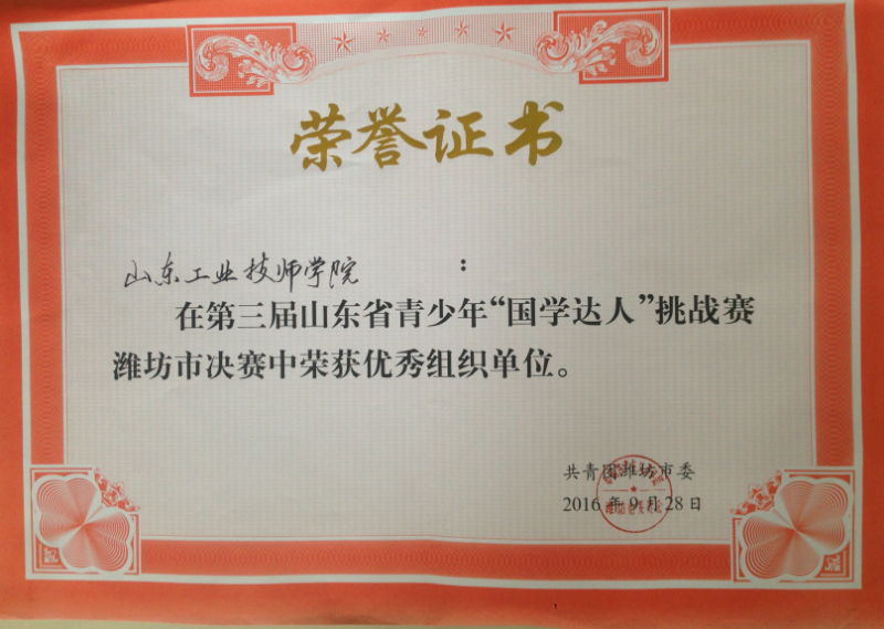 9月27日,由潍坊团市委主办的第三届山东省青少年“国学达人”挑战赛(潍坊市大学组)决赛落下了帷幕。 本次比赛共有驻潍13所高校参加。我院团委在前期选拔和培训的基础上,选派机电工程系的许娜、高梦悦和张火炬等3...