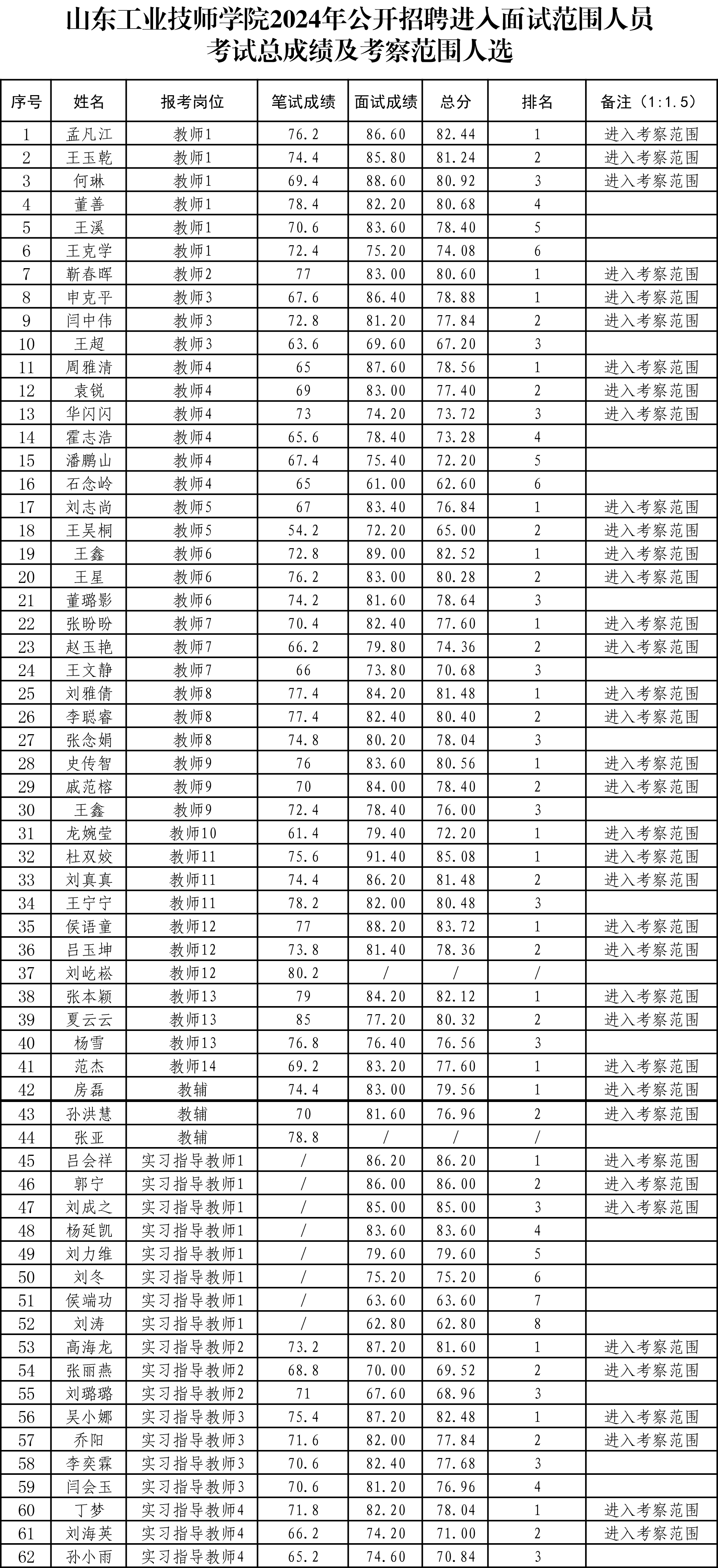 附件:山东工业技师学院2024年公开招聘进入面试范围人员考试总成绩及考察范围人选