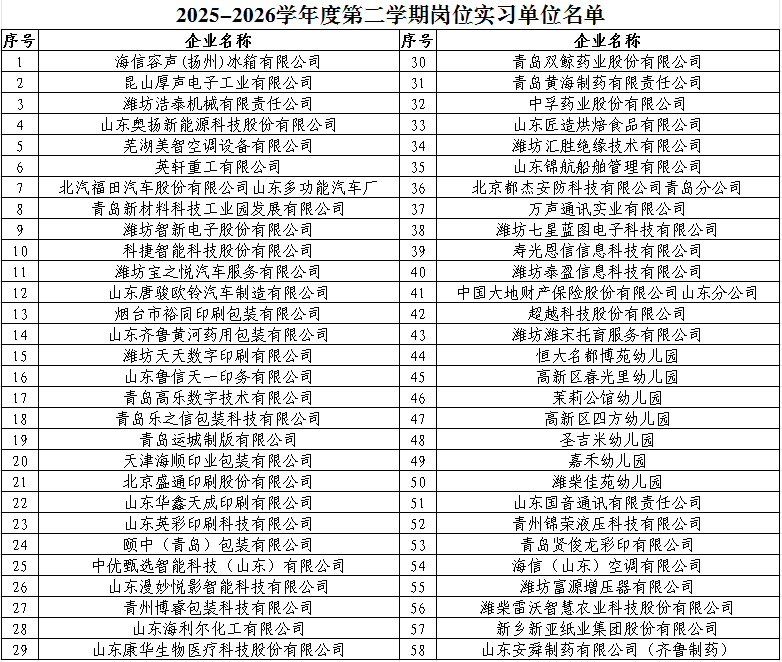 根据《职业学校学生实习管理规定》(教职成〔2021〕4号)等文件规定要求,经学院党委会研究确定,现将2025-2026学年度第二学期岗位实习单位名单公布如下: