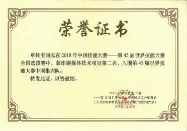 2016年6月参加第44届世界技能大赛印刷媒体技术项目山东省选拔赛获得二等奖,2016年8月参加第44届世界技能大赛印刷媒体技术项目全国选拔赛获得第三名,并入选国家集训队,2018年6月参加第45届世界技能大赛印刷媒体技术项目全国选拔赛获得第二名,再次入选国家集训队,2019年3月成为第45届世界技能大赛印刷媒体技术项目备选选手。