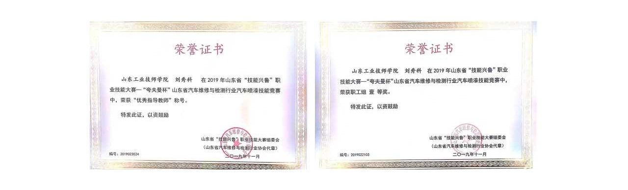 2019年,荣获山东省“技能兴鲁”职业技能大赛——“夸夫曼杯”山东省汽车维修与检测行业汽车喷漆技能竞赛职工组一等奖;2019年,指导学生在山东省“技能兴鲁”职业技能大赛——“夸夫曼杯”山东省汽车维修与检测行业汽车喷漆技能竞赛学生组荣获二等奖;2019年,荣获山东省“技能兴鲁”职业技能大赛——“夸夫曼杯”山东省汽车维修与检测行业汽车喷漆技能优秀指导教师。2020年,指导学生在山东省“技能兴鲁”职业技能大赛——“北汽杯”汽车维修工新能源比赛团体赛荣获三等奖;2020年,在山东省“技能兴鲁”职业技能大赛——“北汽杯”汽车维修工新能源比赛荣获优秀指导教师。2022年,获得“山东工业技师学院技术能手”称号。