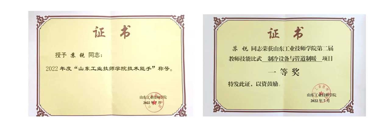 获得2018-2019年度“优秀班主任”、2018年度“爱国卫生工作先进个人”、2020年春季新生军训“优秀教官”、第三届校园技能文化节社会体育指导(健身)比赛二等奖、2022年“优秀共产党员”、2022年度“优秀教师”、2022年,在 学院第二节教师技能比武制冷设备与管道制暖项目中荣获一等奖。被评为山东工业技师学院技术能手等荣誉称号。