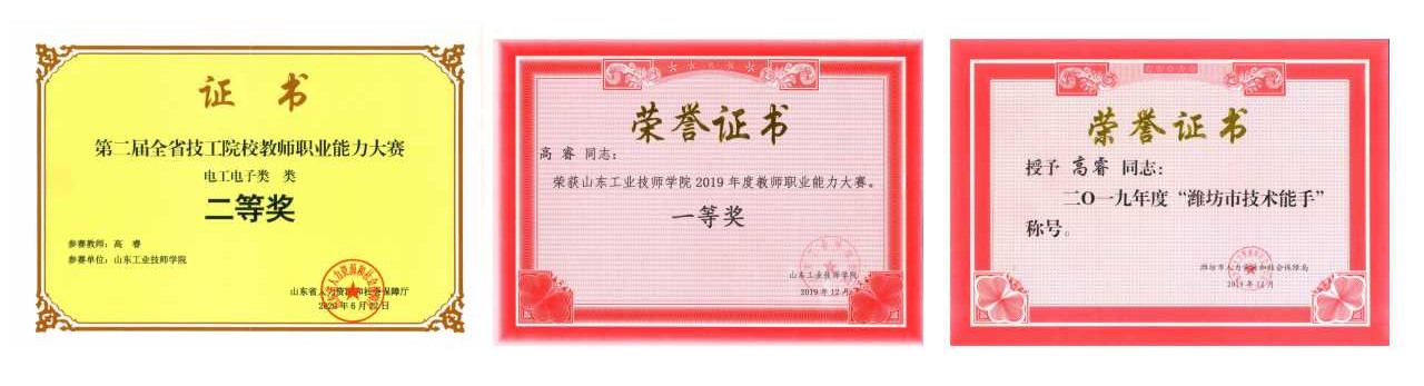 2018年和2019年,在山东工业技师学院教师职业能力大赛中,荣获一等奖;2018年,在“创青春”省大学生创业大赛中指导学生获得铜奖;2019年,在第二届全省技工院校教师职业能力大赛中,荣获电工电子类二等奖;2019年,在第三届山东省黄炎培职业教育创新创业大赛中指导学生获得三等奖,被评为“优秀指导教师”;2019年,获得“潍坊市技术能手”称号。