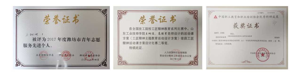2014年,教案《铰链四杆机构的运动特性》获全省技工院校优秀教研成果一等奖。2017年教案《凸轮机构工作过程及从动件运动规律》获全省技工院校优秀教研成果一等奖。2017年,《工匠精神主题教育活动设计方案》在全国技工院校工匠精神主题教育活动中获二等奖。2017年教案《凸轮机构运动过程及从动件运动规律》获全国技工院校优秀教研成果一等奖,论文《如何有效提高技工院校学生的学习积极性》获全国技工院校优秀教研成果二等奖。2022年7月参加学院第二届教师技能大比武平版印刷工项目获一等奖,并荣获山东工业技师学院技术能手荣誉称号。