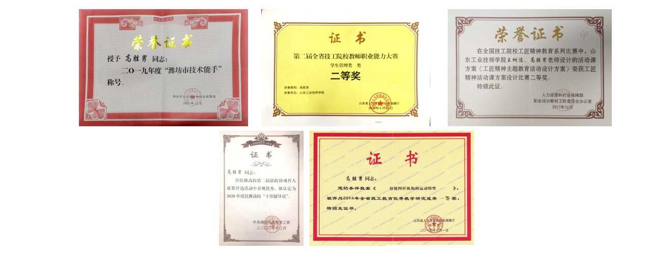 2011年,在山东省技工院校说课比赛中获三等奖。2012年,课件《铰链四杆机构的组成和分类》获全省技工院校优秀教研成果一等奖。2014年,教案《铰链四杆机构的运动特性》获全省技工院校优秀教研成果一等奖。2017年教案《凸轮机构工作过程及从动件运动规律》获全省技工院校优秀教研成果一等奖。2017年,《工匠精神主题教育活动设计方案》在全国技工院校工匠精神主题教育活动中获二等奖。2019年10月参加潍坊市第一届教师职业能力大赛学生管理类获第一名,同年参加山东省第二届教师职业能力大赛学生管理类比赛获二等奖。2019年12月参加驻潍高校第二届思政铸魂育人成果“十佳辅导员”的评选,获第一名。