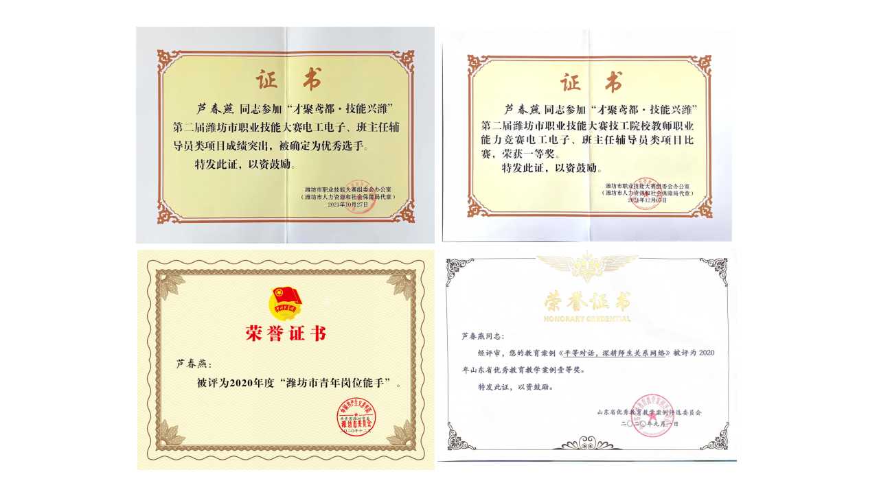 2020年,在山东工业技师学院第一届教练技能大赛印刷媒体技术项目中,荣获第二名;2020年,在山东工业技师学院教师职业能力竞赛中,荣获一等奖;2021年11月,在“才聚鸢都·技能兴潍”第二届潍坊市职业技能大赛技工院校教师职业能力竞赛中,获得潍坊市一等奖,被评为“优秀选手”、“潍坊市技术能手”。