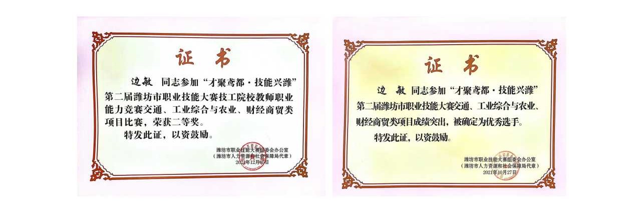2020年,在潍坊市职业技能大赛技工院校教师职业能力大赛中获二等奖;2021年,在学院第二届教师技能大赛—电子商务技能比赛中获得一等奖,被评为“山东工业技师学院技术能手”。
