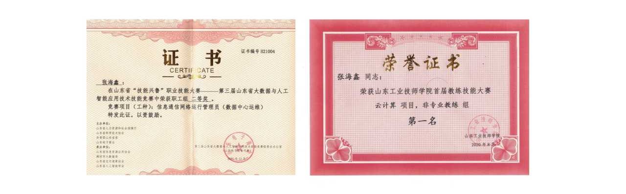 2020年,在山东工业技师学院第一届教师职业技能比赛(非教练组)中获得“云计算项目”第一名、“网络综合布线项目”第一名;2021年,在山东省技能兴鲁职业技能大赛——第三届山东省大数据与人工智能应用技术技能竞赛职工组中荣获二等奖(第四名);2021年,在山东省技能兴鲁职业技能大赛——第三届山东省大数据与人工智能应用技术技能竞赛中指导学生荣获一等奖(第一名);2022年,在山东工业技师学院第二届教师技能大比武“网络综合布线项目”中获得一等奖(第二名),被评为“山东工业技师学院技术能手”。