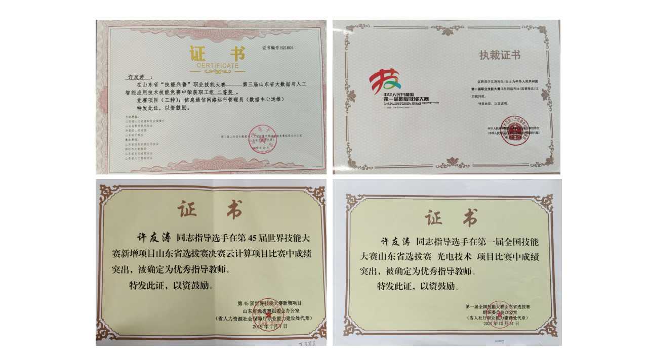 2021年,在山东省“技能兴鲁”职业技能大赛第三届山东省大数据与人工智能应用技术技能竞赛信息通信网络运行管理员(数据中心运维)赛项职工组比赛中获得二等奖;2022年参加山东工业技术学院教师技能大赛信息网络布线项目第一名。