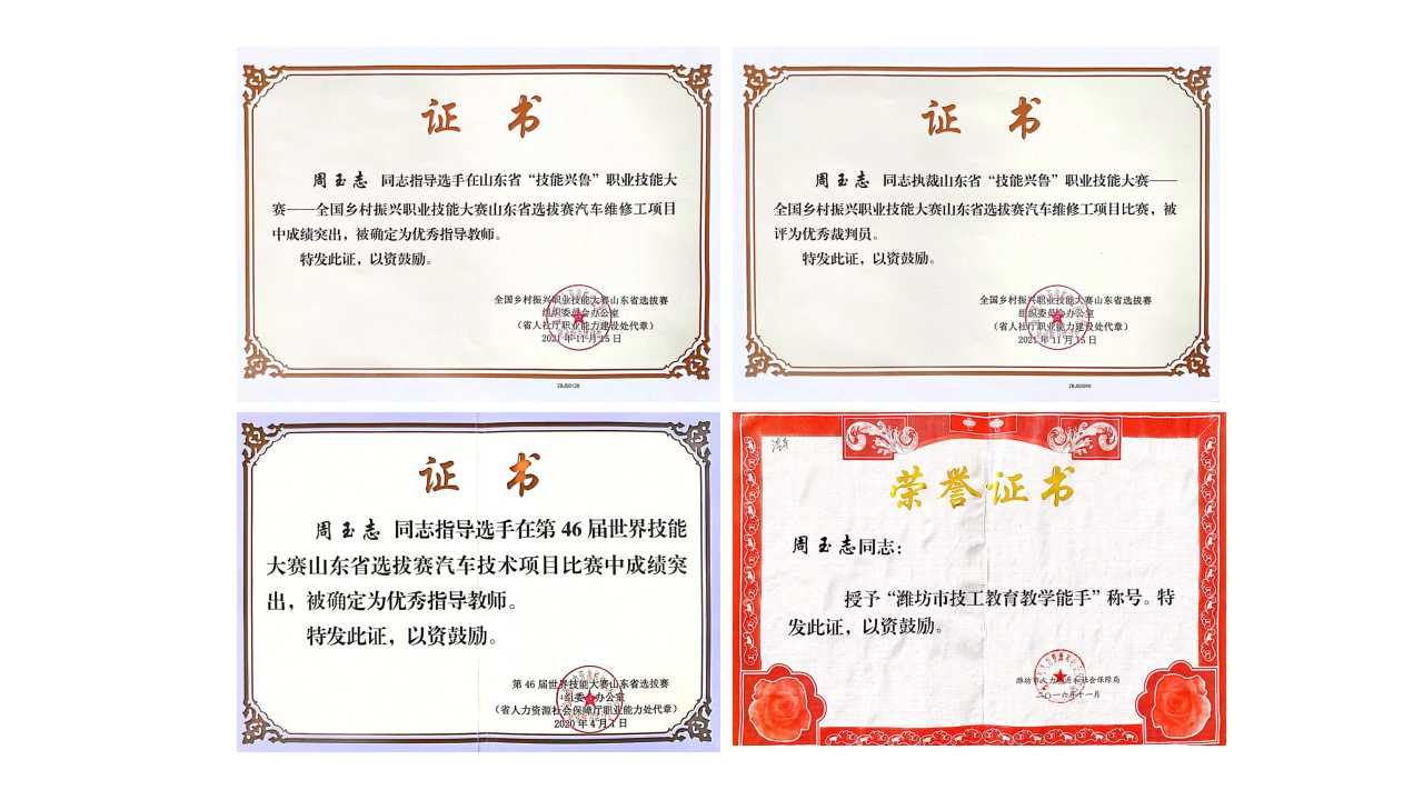 2014年,在第43届世界技能大赛山东省选拔赛汽车技术项目中指导学生获得三等奖,被评为“优秀指导教师”;2019年,在第46届世界技能大赛山东省选拔赛汽车技术项目中指导学生获得二等奖(第五名),被评为“优秀指导教师”。