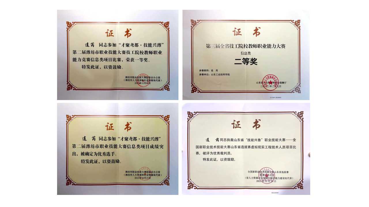2021年,在第二届潍坊市职业技能大赛技工院校教师职业能力竞赛中获得信息类一等奖(第一名)、第三届全省技工院校教师职业能力大赛中获得二等奖。2021年,在山东省“技能兴鲁”职业技能大赛--全国新职业技术技能大赛山东省选拔赛虚拟现实工程技术人员项目比赛项目中担任裁判员,被评为优秀裁判员。