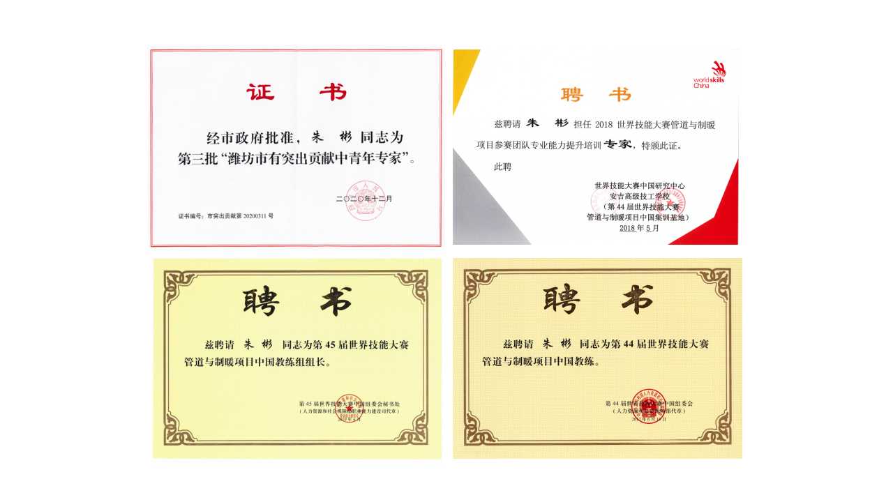 朱彬,山东工业技师学院机电工程系实习指导教师,朱彬技能大师工作室负责人,第46届世界技能大赛管道与制暖项目中国技术指导专家、第45届世界技能大赛管道与制暖项目中国教练组组长、第44届世界技能大赛管道与制暖项目中国教练、第45届世界技能大赛中国国家队技术保障团成员、潍坊市有突出贡献中青年专家、第45-46届世界技能大赛山东省选拔赛优秀指导教师、世界技能大赛管道与制暖项目参赛团队专业能力提升培训专家、山东省技工教育先进个人、潍坊市青春担当好青年、潍坊市青春担当好团成员。
