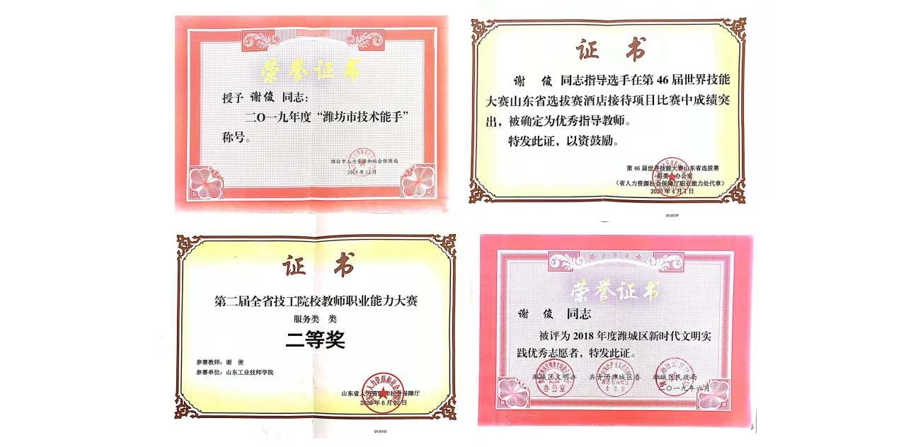2017年,获得山东工业技师学院教师教学业务竞赛一等奖;2017年和2019年,分别在首届和第二届全省技工院校教师职业能大赛中,荣获服务类二等奖;2019年,指导学生在第46届世界技能大赛山东省选拔赛酒店接待项目中获得山东省三等奖(第十名),被评为优秀指导教师。