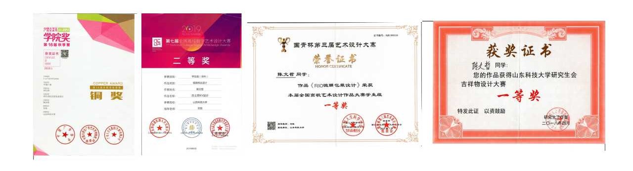 2019年,在全国高校美育成果展中,荣获一等奖;2019年,在国青杯第三届艺术设计大赛中,荣获一等奖;2019年,在第七届全国高校数字艺术设计大赛中荣获二等奖;2022年10月,荣获“山东工业技师学院技术能手”称号。