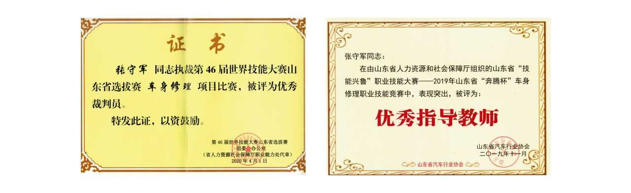 2018年,在第45届世界技能大赛山东省选拔赛车身修理赛项中担任裁判并获评优秀裁判员;2019年,在山东省“技能兴鲁”职业技能大赛车身修理技能竞赛中获得职工组三等奖。2020年,在第46届世界技能大赛山东省选拔赛车身修理赛项中担任裁判并获评优秀裁判员;