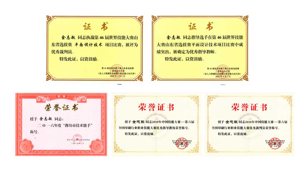 金志敏,山东工业技师学院印刷工程系副主任,本科学历,工程硕士学位,高级讲师,高级技师。先后荣获全国印刷行业职业技能大赛优秀裁判员和优秀指导教练荣誉称号,潍坊市技术能手。