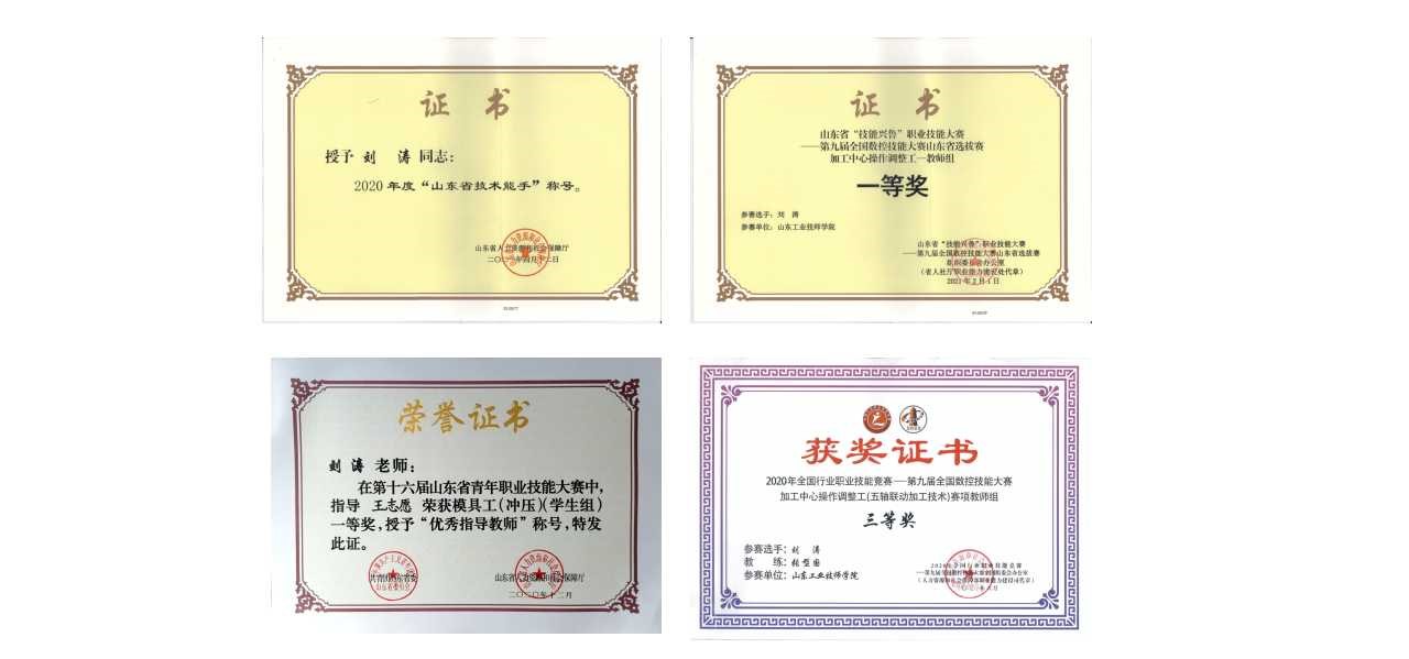2019年9月,参加山东省“技能兴鲁”职业技能大赛—全省数控机床职业技能竞赛,获得数控铣职工(教师组)二等奖;2020年12月,参加第九届全国数控技能大赛山东省选拔赛加工中心操作调整工教师组一等奖;2021年4月,获得山东省技术能手称号;2021年5月参加第九届全国数控技能大赛决赛加工中心操作调整工获得三等奖。