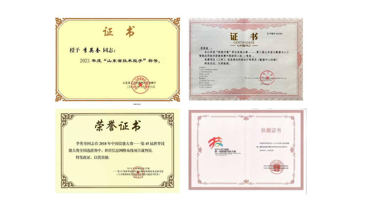 2014年,在中国技能大赛信息网络布线项目山东省选拔赛中担任裁判员;2018年,在第45届世界技能大赛信息网络布线项目全国选拔赛中担任裁判员;2020年,在全国职业院校技能大赛网络布线项目中担任裁判员;2020年,在中华人民共和国第一届职业技能大赛信息网络布线项目中担任裁判员;2021年,在山东省“技能兴鲁”职业技能大赛第三届山东省大数据与人工智能应用技术技能竞赛中获信息通信网络运行管理员赛项职工组获得第一名。