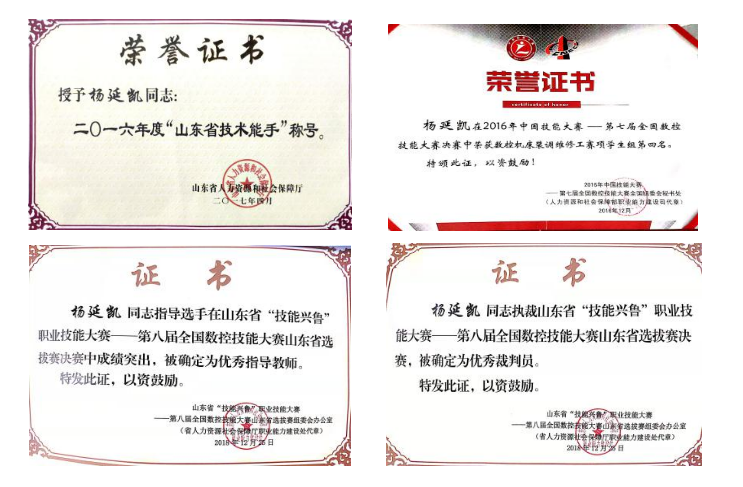 2016年,第七届全国数控技能大赛决赛数控机床装配与维修赛项学生组一等奖(第四名)、获得山东省技术能手称号;2018年,指导学生参加第八届全国数控技能大赛山东省选拔赛数控机床装配与维修赛项学生组二等奖(第二名),获优秀指导教师称号;2018年,在执裁第二届全国智能制造应用技术技能大赛山东省选拔赛中,被评为优秀裁判员称号;2020年,指导学生、教师两个组别参加第九届全国数控技能大赛山东省选拔赛数控机床装配与维修赛项一等奖(第一名),被评为优秀指导教师称号。2021年,指导学生参加第九届全国数控技能大赛决赛数控机床装配与维修赛项学生组二等奖(第七名)。2021年,指导学生参加全国选拔赛初赛“西门子杯”智能制造挑战赛数字化双胞胎赛项学生组获一等奖(第十名)。2021年,指导学生参加第四届全国智能制造应用技术技能大赛钳工赛项学生组三等奖(第四名),被评为优秀指导教师。2021年在执裁山东省“技能兴鲁”职业技能大赛—山东省轻工行业职业技能竞赛(制浆工)赛项决赛中,被评为优秀裁判员。