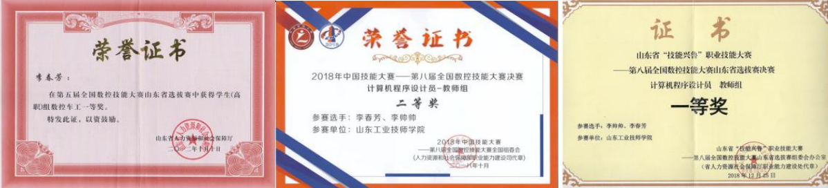 2012年,在第五届全国数控技能大赛山东省选拔赛荣获一等奖(第五名);2018年,第八届全国数控技能大赛山东省选拔赛计算机程序员项目一等奖(第一名);2018年,第八届全国数控技能大赛决赛计算机程序员项目二等奖(第十四名);2018年,在第八届全国数控技能大赛山东省选拔赛计算机程序员项目中指导学生获得一等奖(第一名);2018年,在第八届全国数控技能大赛决赛计算机程序员项目中指导学生获得二等奖(第十三名);2018年,在第45届世界技能大赛机械行业全国选拔赛塑料模具项目中指导学生获得三等奖;2018年,在第45届世界技能大赛山东省选拔赛塑料模具项目中指导学生获得三等奖(第五名);2019年,首届上海合作组织国家职业技能大赛-CAD机械设计中指导学生获得二等奖;2019年,在第46届世界技能大赛山东省选拔赛塑料模具项目中指导学生获得二等奖(第三名)进入省集训队;2019年,在第46届世界技能大赛山东省选拔赛CAD机械设计项目中指导学生获得二等奖(第七名)进入省集训队;2020年,在第十六届山东省青年职业技能大赛决赛模具工项目中指导学生获得一等奖(第一名);2020年,在第十六届“振兴杯”全国青年职业技能大赛决赛模具工项目中指导学生获得三等奖(第十四名);2020年,在第一届中国职业技能大赛塑料模具工程项目中指导学生获得优胜奖(第十名)进入国家集训队。