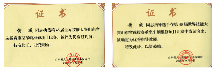 2018年,在第45届世界技能大赛重型车辆维修项目山东省选拔赛中,指导学生获得第五名;2019年,在第46届世界技能大赛重型车辆维修项目山东省选拔赛中,指导学生获得第六名。