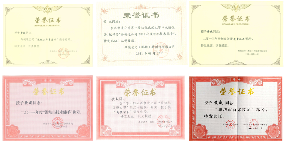 2013年,获“潍坊市技术能手”荣誉称号;2018年,获“潍坊市首席技师”荣誉称号;2011年 ,获潍柴动力(潍坊)再制造公司“装配技术能手”荣誉称号;2013年 ,获潍柴动力(潍坊)再制造公司“质量标兵”荣誉称号;2014年,获潍柴动力(潍坊)再制造公司“全工序多面手”荣誉称号;2014年,获潍柴动力(潍坊)再制造公司“岗位能手”荣誉称号;2018年,获第45届世界技能大赛重型车辆维修项目山东省选拔赛“优秀指导教师”荣誉。