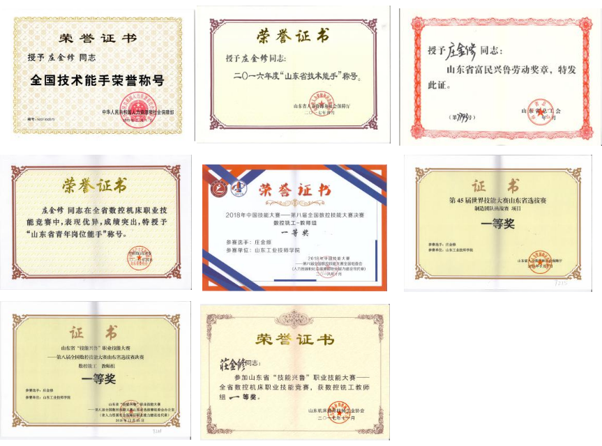 2016年,参加第七届全国数控技能大赛山东省选拔赛获得四轴加工中心职工组第一名。2016年,参加第七届全国数控技能大赛全国决赛获得四轴加工中心职工组优秀奖。2016年,获得山东省技术能手称号。2017年,参加山东省”技能兴鲁“职业技能大赛获得数控铣教师组第二名。2017年,获得山东省青年岗位能手称号。2018年,参加第四十五届世界技能大赛山东省选拔赛获得制造团队挑战赛数控铣项目第一名。2018年,参加第八届全国数控技能大赛山东省选拔赛获得数控铣项目教师组第一名。2018年,参加第八届全国数控技能大赛总决赛获得数控铣项目教师组第四名。2018年,获得山东省富民兴鲁劳动奖章。2019年,获得全国技术能手称号。2020年,获得山东惠才卡。