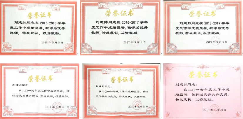 工作期间多次被学院评为优秀教师和优秀共产党员:2015-2016学年学院优秀教师;2016-2017学年学院优秀教师,2018-2019学年学院优秀教师;2013年度优秀共产党员,2014年度优秀共产党员,2017年度优秀共产党员。