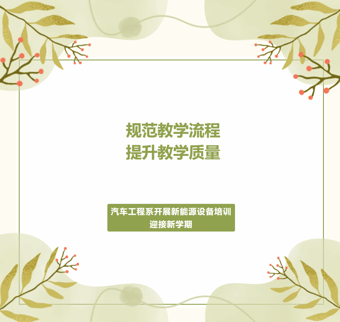 新学期伊始,为全面提升课堂教学质量,规范教学管理,确保各项教学工作有序高效开展,汽车工程系于9月10日组织了面向系部全体教师的教学能力提升培训活动。本次培训聚焦课堂教学规范、学生学习状态把握以及新能源专业设备操作三大核心板块,为新学期教学工作注入新动能。