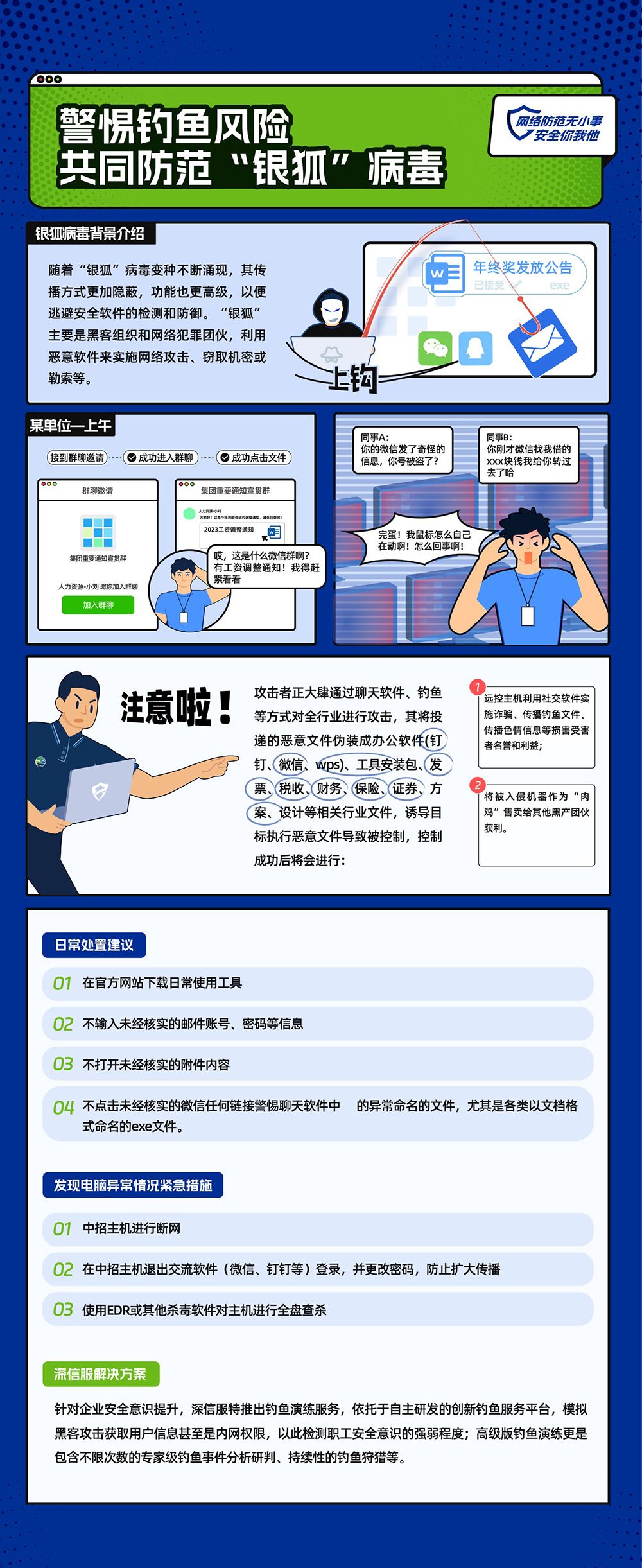 银狐(又名:“游蛇”“谷堕大盗”等)是一款专门针对企事业单位管理、财务等从业人员进行攻击的木马病毒变种之一 ,通过微信、QQ、邮件以及伪造工具网站等渠道进行钓鱼攻击,主要面向政府、高校及企事业单位等关键行业 ,攻击目标集中在财务和会计领域的专业人员,多采用进程注入、无文件攻击及签名伪造等多种技术绕过安全防护,远程控制受害者的计算机,窃取用户的敏感数据和财产信息,并通过监控受害者的日常操作,达到窃取隐私的目的,为后续实施诈骗等行为铺路,具有高度隐蔽性,对企事业单位和个人的信息安全构成严重威胁。