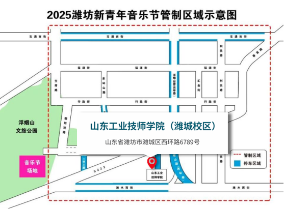 7月5日-7月6日,2025潍坊·新青年音乐节在浮烟山国际风筝放飞场举行,我院潍城校区(面试考点)被纳入交通管制区域,管制时间为11时至23时。